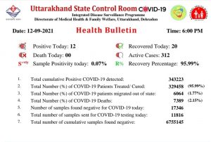 हैल्थ बुलेटिन के अनुसार, पौड़ी गढ़वाल में आज़ सबसे ज्यादा 4 लोग कोरोना पॉजिटिव पाए गए हैं। नैनीताल और उत्तरकाशी में 2-2 मरीज पाए गए हैं। चंपावत, देहरादून, रुद्रप्रयाग व उधमसिंहनगर में कोरोना का 1-1 मरीज सामने आया है। संतोषजनक खबर यह भी है कि पिछले 24 घंटों में जनपद अल्मोड़ा, बागेश्वर, चमोली, हरिद्वार, पिथौरागढ़ व टिहरी गढ़वाल में किसी भी व्यक्ति की कोरोना जांच रिपोर्ट पॉजिटिव नहीं पाई गई है। हालांकि राज्य में अब भी 312 लोग विभिन्न चिकित्सालयों में कोरोना से जिंदगी की जंग लड़ रहे हैं। विस्तृत जानकारी के लिए देखिए स्वास्थ्य विभाग द्वारा जारी हैल्थ बुलेटिन-
