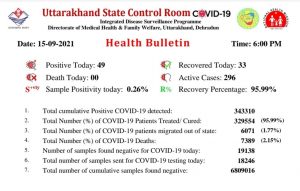 देहरादून, 15 सितंबर। उत्तराखंड में कोरोना संक्रमण की सुस्त पड़ती रफ़्तार के चलते शुरू हुई लोगों की लापरवाही भारी पड़ने लगी है। राज्य में संक्रमण का ग्राफ एक बार फिर ऊपर चढ़ता नज़र आ रहा है। स्वास्थ्य विभाग द्वारा जारी बुधवार शाम तक का हेल्थ बुलेटिन देखकर यही लगता है। बुलेटिन के अनुसार, राज्य में पिछले 24 घंटों के दौरान 49 लोगों की कोरोना जांच रिपोर्ट पॉजिटिव पाई गई है। राज्य में अब तक कोरोना संक्रमित हुए लोगों की कुल संख्या 343310 पहुंच गयी है। राहत की बात यह रही कि पिछले 24 घंटों के दौरान राज्य में कोरोना संक्रमण से किसी की जान नहीं गई। हालांकि अब भी उत्तराखंड में कोरोना के 296 एक्टिव मामले हैं। बुधवार को विभिन्न अस्पतालों में भर्ती कोरोना के 33 मरीजों ने महारोग पर विजय पाकर घर वापसी की है।