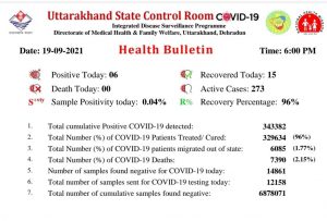 देहरादून, 19 सितंबर। उत्तराखंड में कोरोना को लेकर रविवार को चौंका देने वाली राहत की खबर आई है। स्वास्थ्य विभाग द्वारा जारी हैल्थ बुलेटिन के अनुसार, आज कोरोना संक्रमण के मात्र 06 मामले सामने आये है। उत्तराखंड में अब तक सामने आए कोरोना संक्रमण के कुल मामलों की संख्या 343382 हो चुकी है। आज़ के दिन तक राज्य में संक्रमण के सक्रिय मामलों की संख्या 273 है। हालांकि पिछले 24 घंटों के दौरान विभिन्न अस्पतालों में भर्ती कुल 15 व्यक्ति ठीक होने के बाद घर वापसी कर चुके हैं। अब तक कोरोना को मात देने में कामयाब रहे ऐसे लोगों की कुल संख्या 329634 हो गई है।