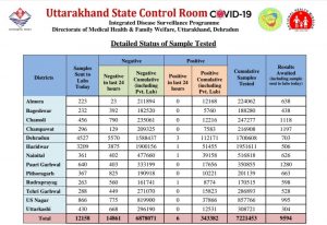 स्वास्थ्य बुलेटिन के अनुसार, उत्तराखंड में कोरोना संक्रमण से ठीक होने की दर अब 96% हो गयी है। 14861 लोगों के सैंपल रिपोर्ट नेगेटिव पाए गए हैं। अभी तक कुल 6878071 लोगों की सैंपल रिपोर्ट नेगेटिव आयी है।